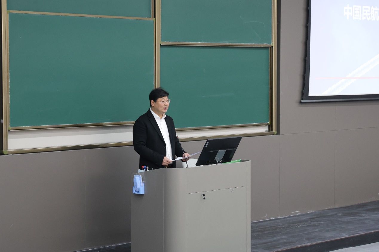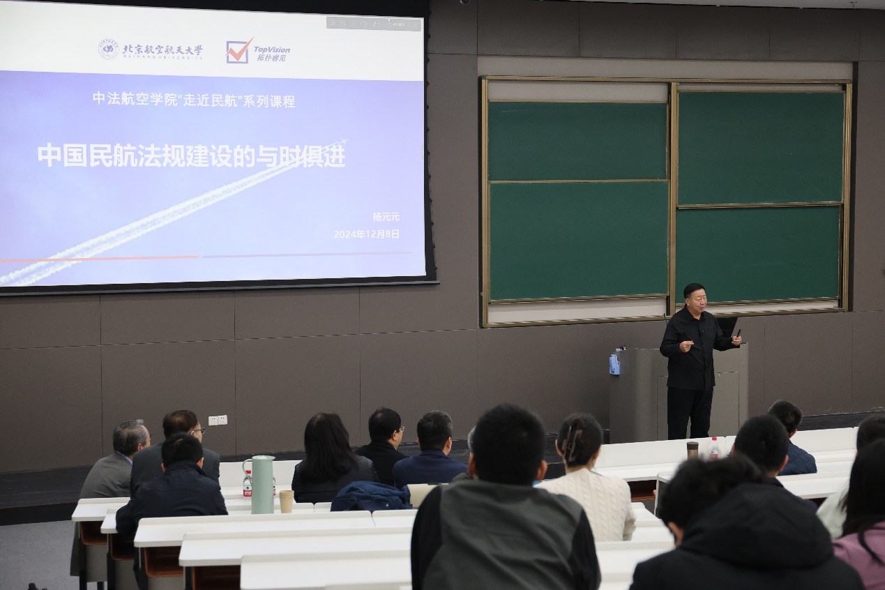 随后,杨元元先生为在场师生带来了题为《中国民航法规建设的与时俱进》的精彩讲座。他以双发延程飞行规则为例,结合亲身经历,生动展示了航空法规如何随着技术迭代和时代发展而不断修改与完善。通过实际案例,他深入讲解了民航法规在运营实践中的应用,并分享了对新态势下民航法规发展的思考与展望。