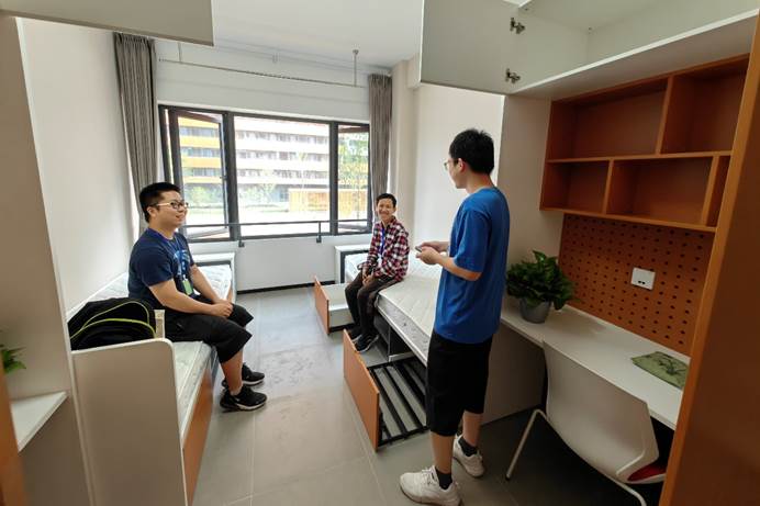 体验活动中,同学们前往学生宿舍进行了简单休整。本科生和硕士生宿舍为双人间,博士生宿舍为单人间,宿舍附近也将配备便利店、菜鸟驿站、文印店、洗衣店等生活便利设施,打造舒适便利的居住环境。