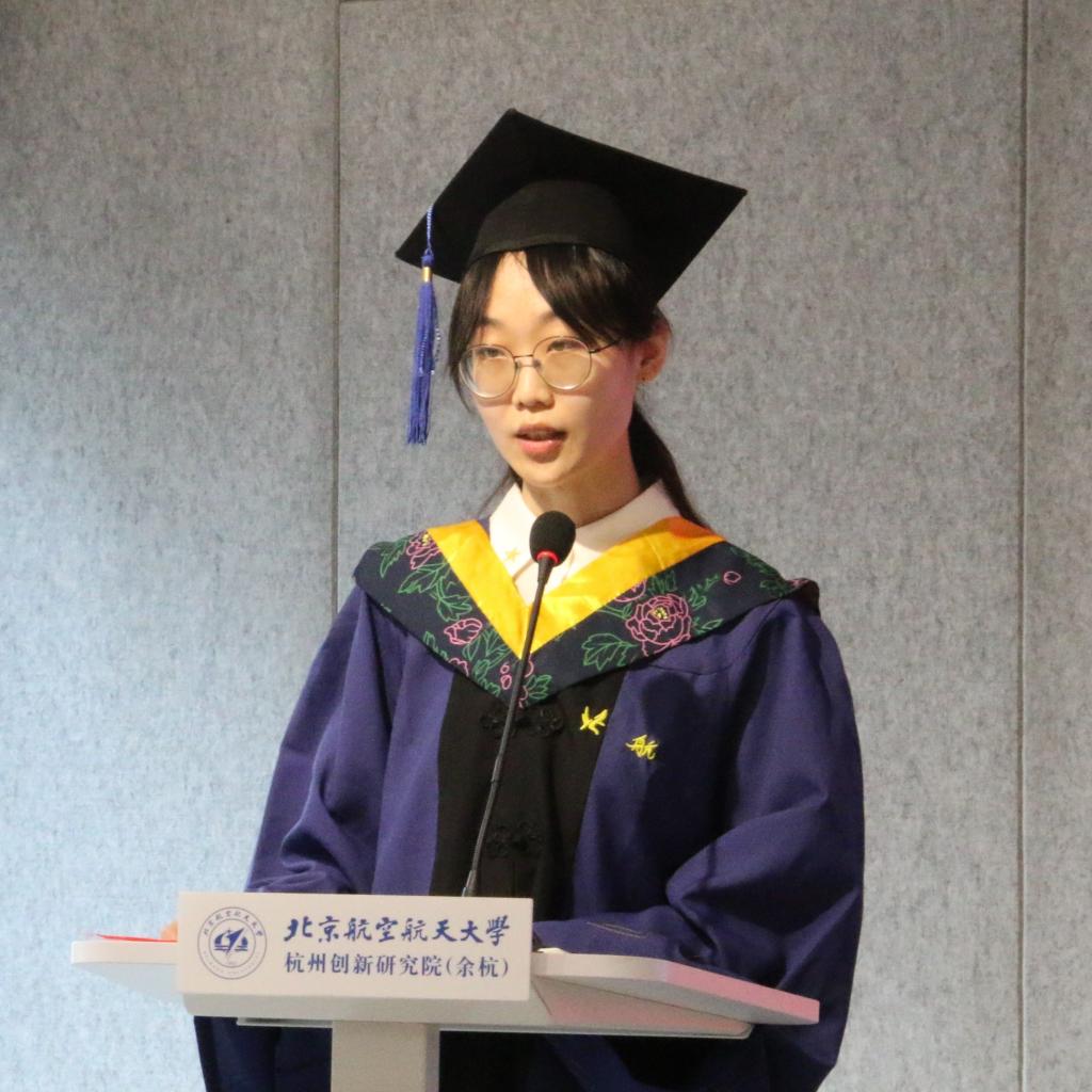 毕业生代表、杨文雪同学带大家回顾了学生生涯中,学习、科研、生活的记忆点滴,表达了对北航的感激之情。