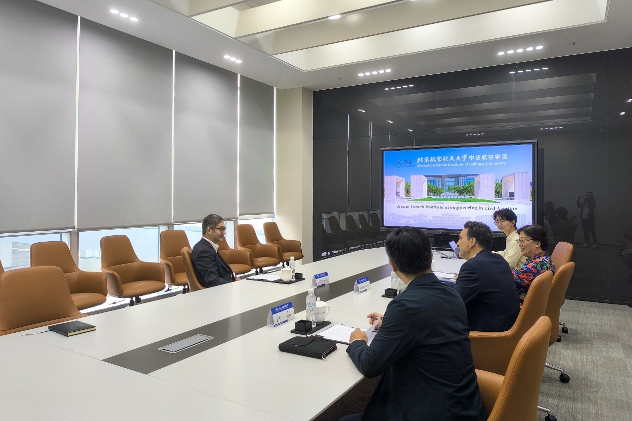 在院期间,北航国新院党委副书记、院长洪冠新,中法航空学院法方院长让帝(Frédéric GENTY)以及国际合作相关负责人与吉耶先生展开座谈交流。双方围绕北航国新院高质量发展和中法航空学院高水平办学工作充分交流,同时就航空领域的最新发展和合作创新进行了深入探讨。