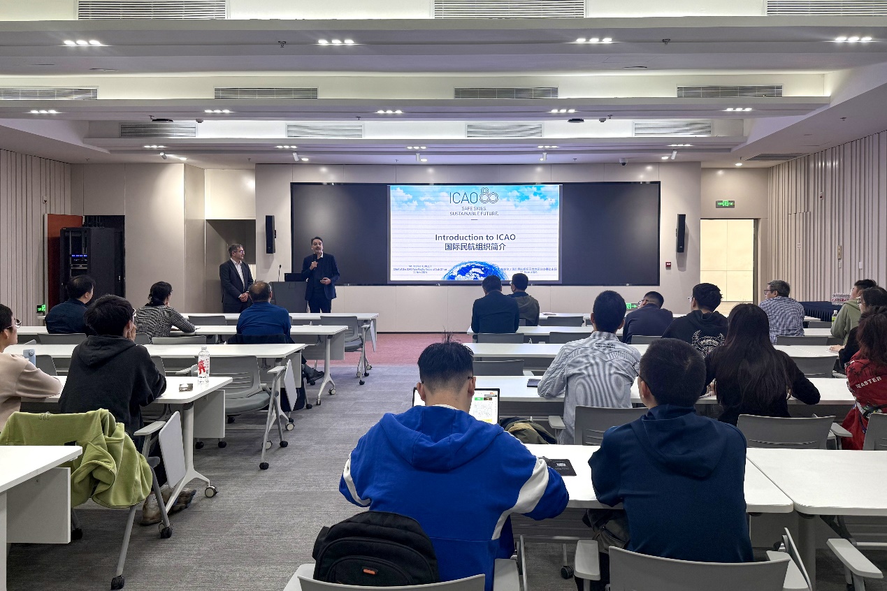 讲座上,吉耶先生从民航业绕不开的《芝加哥公约》入题,用风趣幽默的语言向师生们介绍了国际民用航空组织的标准制定、安全监督审核程序以及在亚太地区的具体工作,并从国际组织的角度对国际民航业的未来发展和空域规划提出专业看法,现场气氛热烈。