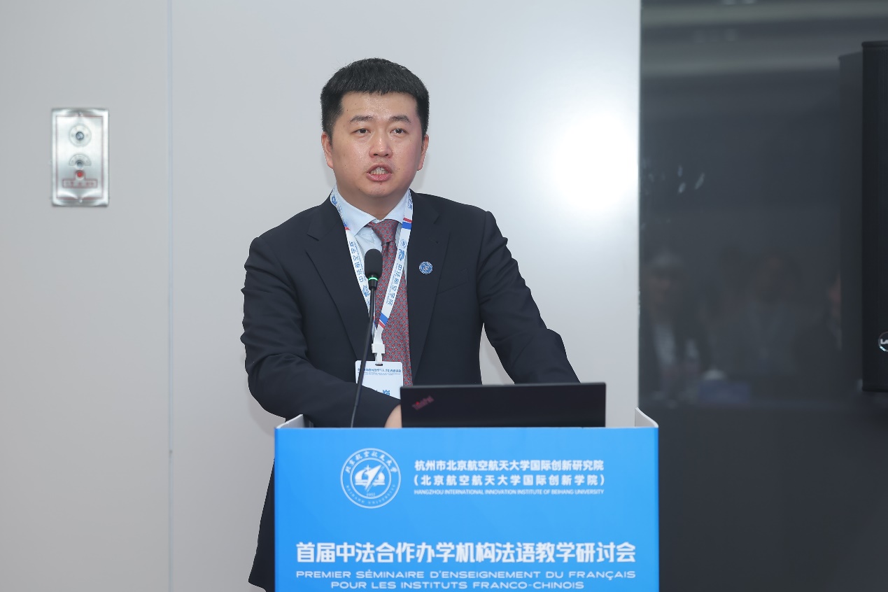 教育部大学外语教学指导委员会委员、山东大学外国语学院副院长刘洪东分享了他对中法合作机构法语教学的洞察,并以“高质量发展”为关键词,从法语教师的个人发展和人工智能对法语教学的影响两方面提出了切实的建议和深刻的思考。他指出,法语教学质量是中法合作机构可持续发展的关键因素之一,希望各中法合作机构充分交流,加强合作,不断提升法语教学质量。