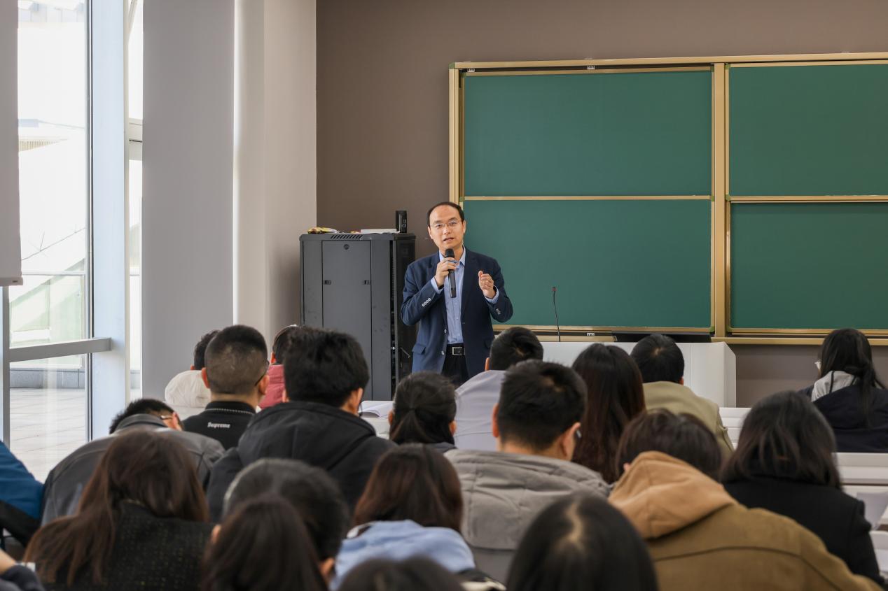 钱政在讲话中对青年教师提出了四点期望,一是在教学中关注学生,根据学生特点调整教学方法与模式。二是做好教学规划,结合自身特长精准选择课程并开展教学探索。三是积极加入教学团队,在老教师的传帮带下快速提升教学能力。四是拥抱未来,积极探索技术赋能教育的新模式。