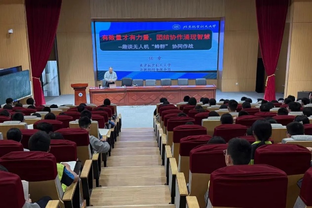 △4月10日,杭州市天元公学高三年级组来到北航杭州国际校园开展研学活动,任章教授为同学们作题为《无人机蜂群作战》的报告