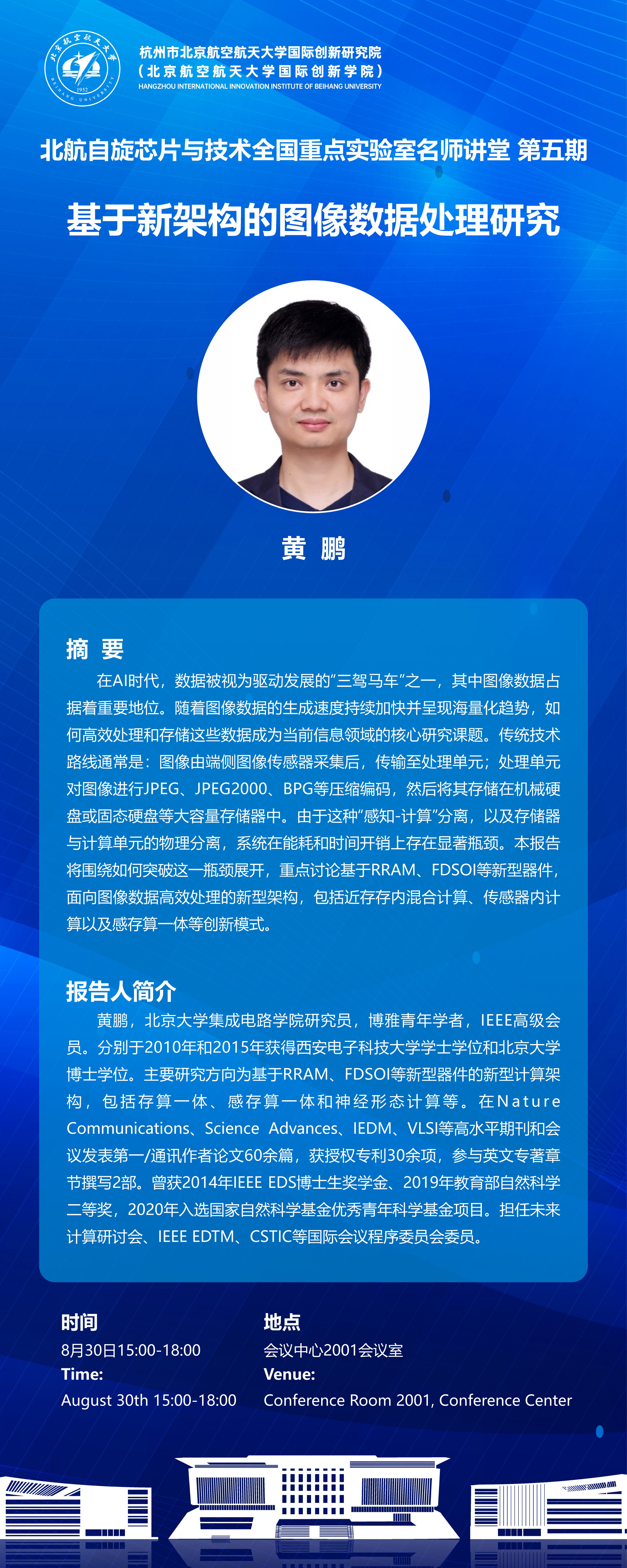 黄鹏,北京大学集成电路学院研究员,博雅青年学者,IEEE高级会员。分别于2010年和2015年获得西安电子科技大学学士学位和北京大学博士学位。主要研究方向为基于RRAM、FDSOI等新型器件的新型计算架构,包括存算一体、感存算一体和神经形态计算等。在NatureCommunications、Science Advances、IEDM、VLSI等高水平期刊和会议发表第一/通讯作者论文60余篇,获授权专利30余项,参与英文专著章节撰写2部。曾获2014年IEEE EDS博士生奖学金、2019年教育部自然科学二等奖,2020年入选国家自然科学基金优秀青年科学基金项目。担任未来计算研讨会、IEEE EDTM、CSTIC等国际会议程序委员会委员。