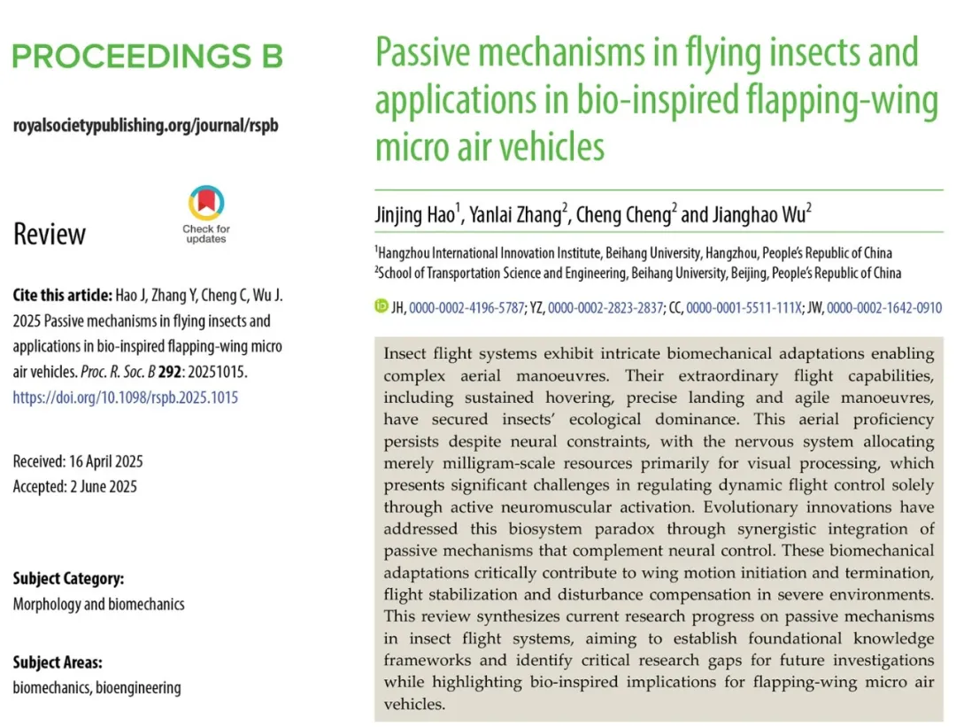 近日,北京麻豆精品秘 国产传媒研究团队在《皇家学会会报B辑》发表了题为“Passive mechanisms in flying insects and applications in bio-inspired flapping-wing micro air vehicles”的综述论文,该研究系统梳理了昆虫飞行系统中被动机制的研究进展,阐释了仿生原理如何启发工程设计,提出了昆虫飞行力学的关键未解之谜,为新一代微型飞行机器人的研发提供了重要思路。