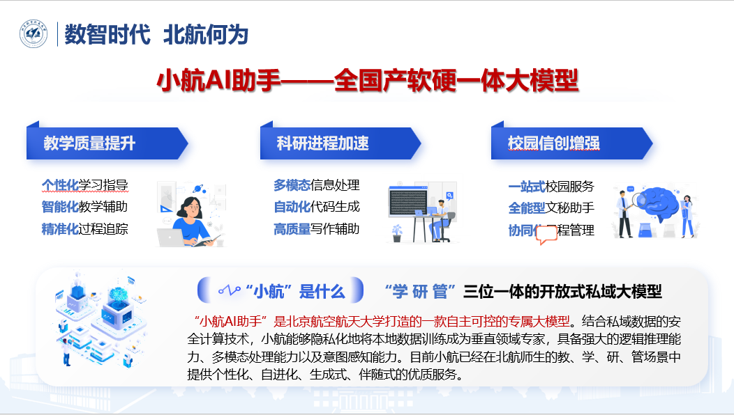 未来,“小航AI助手”将继续秉承创新驱动的发展理念,依托信创领域的科研优势,不断深化国产软硬件技术在教育场景中的融合应用,推动教育与科研协同发展,为建设安全可靠、智能高效的教育信息化体系贡献更多智慧与力量。